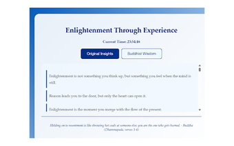 Enlightenment Through Experience, Chrome tarayıcıları için geliştirilmiş ücretsiz bir eklentidir. Bu eklenti, orijinal içgörüler ve Budist bilgeliği kategorilerinde 100'den fazla farkındalık alıntısı sunarak kullanıcıların zihinsel huzur bulmalarına yardımcı olmayı amaçlamaktadır. Her bir alıntı, derin düşünceler ve içsel huzur arayışını teşvik eden bir anlayışla tasarlanmıştır.